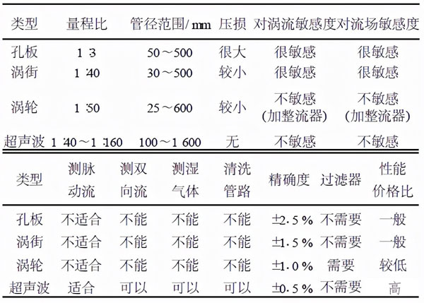 流量計(jì)性能比較: